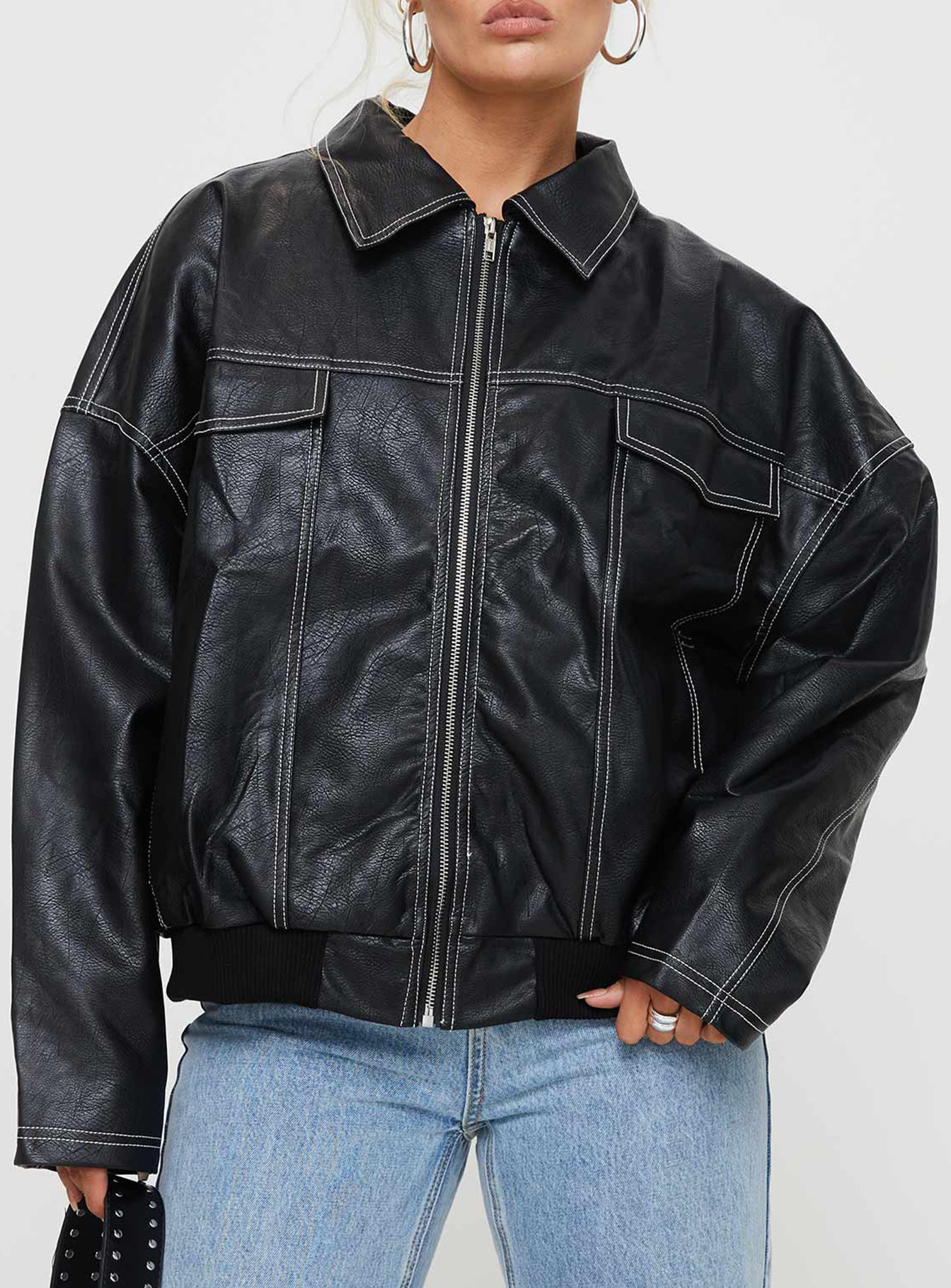 Contrast Stitch Pu Biker Jacket